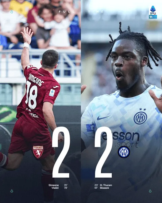 虎扑04月26日讯 意甲第34轮,都灵主场2-2战平国米。